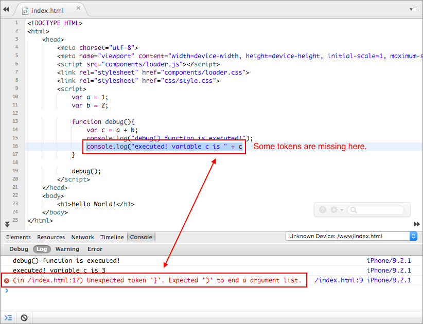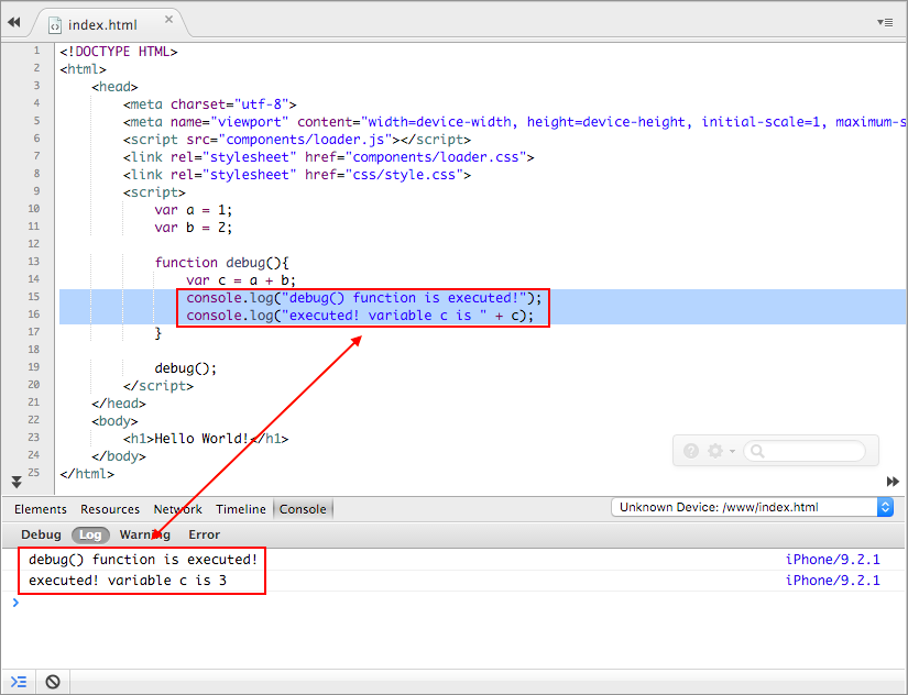 There are 2 main debugging functionalities that can be used to debug Monaca apps with the Monaca Cloud IDE: