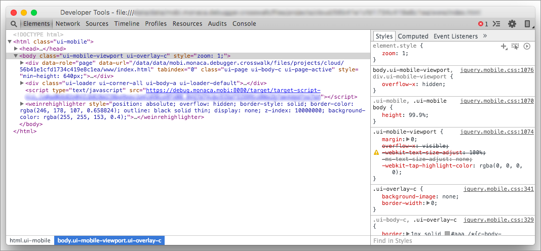 A popular web debugging tool, Weinre (WEb INspector REmote), is embedded in the debug panel of the Monaca Cloud IDE. This tool allows you to debug your app using console debugging and DOM inspection.