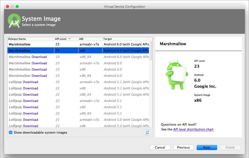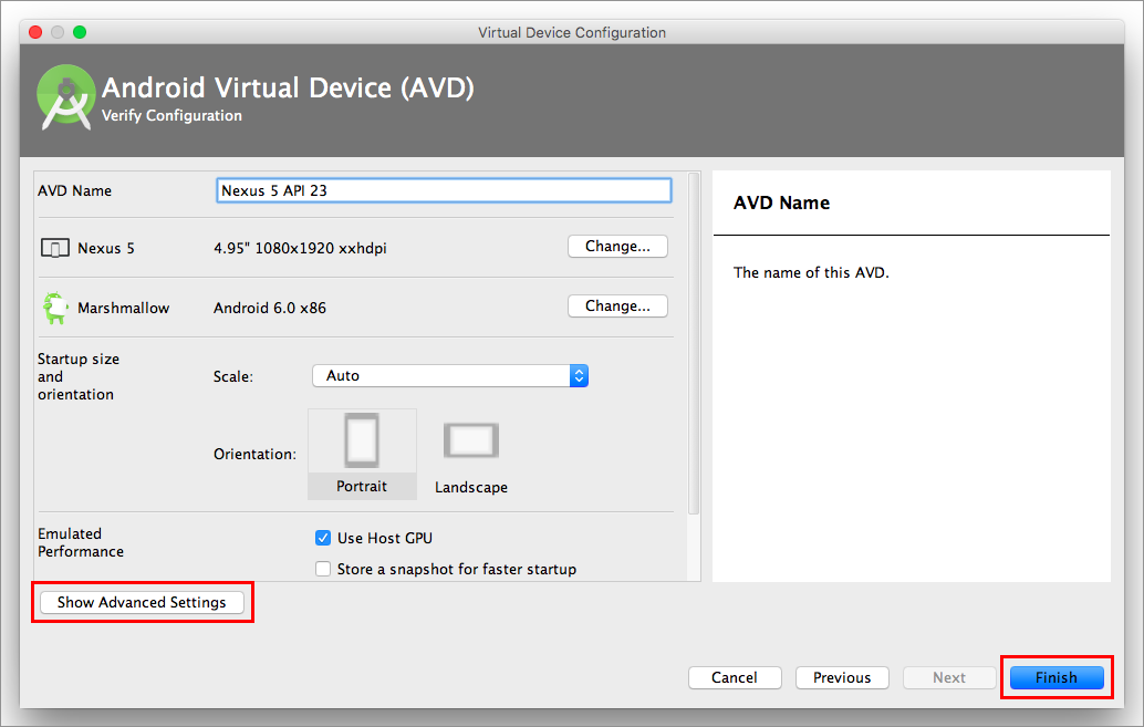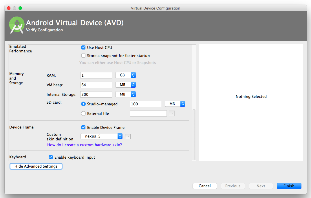 7. Make the virtual device’s configurations. Select Show Advanced Settings for other settings such as memory, storage, device frame and keyboard.