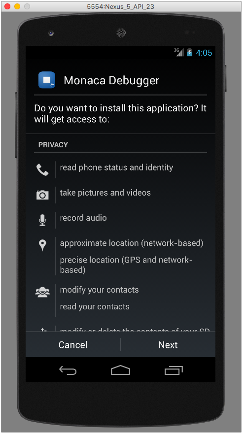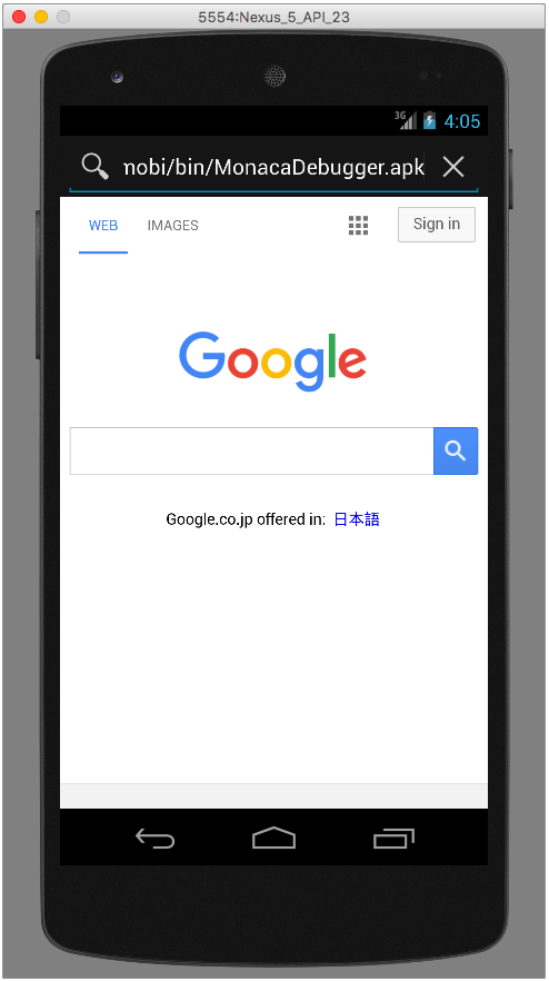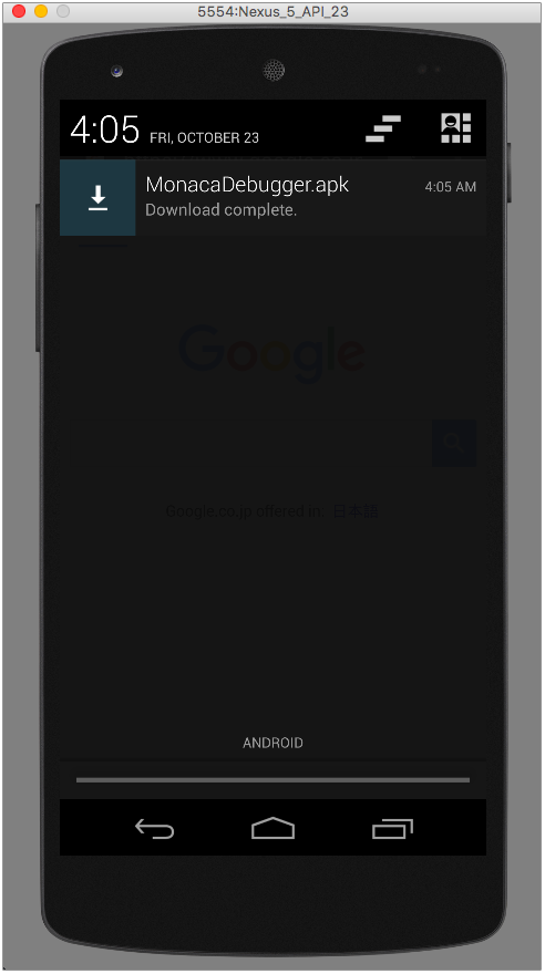 2. On your virtual device, open a browser and the download link you created in the previous step to download the custom Monaca Debugger for Android.