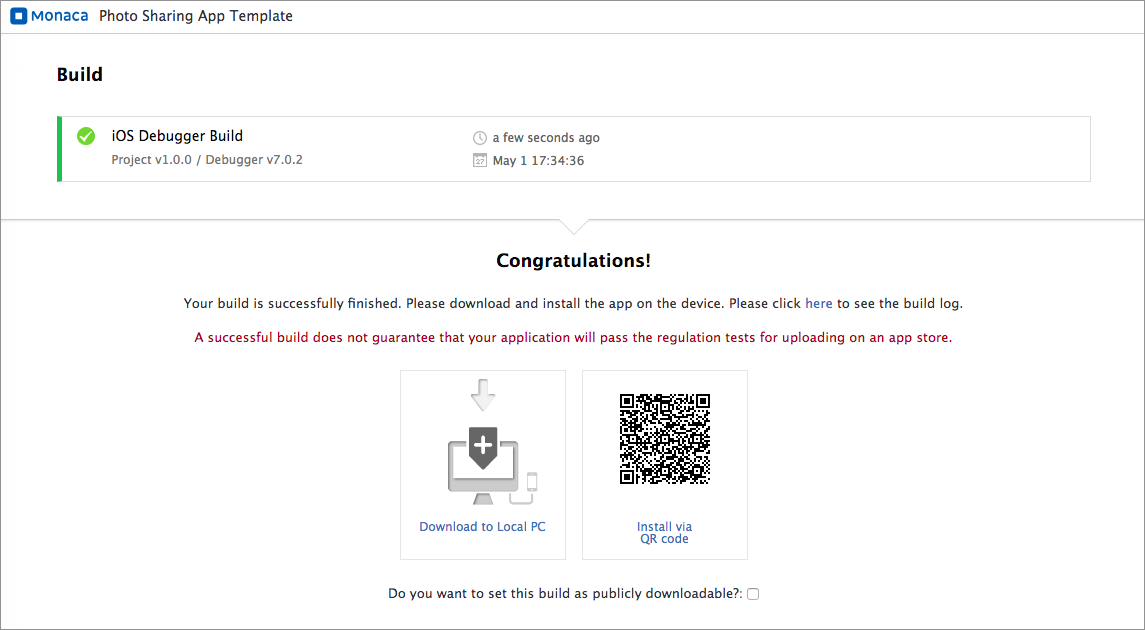3. It may take some time until the build is completed. The following screen will open after the build is successfully completed. Then, you can use the QR code to install the debugger on your device or download the built file to your PC.