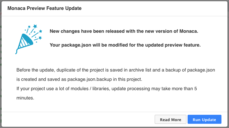 6. The following dialog will be displayed if your project’s package.json doesn’t have the monaca:preview script. Please click Run Update to continue the migration process. Read this for more detail.
