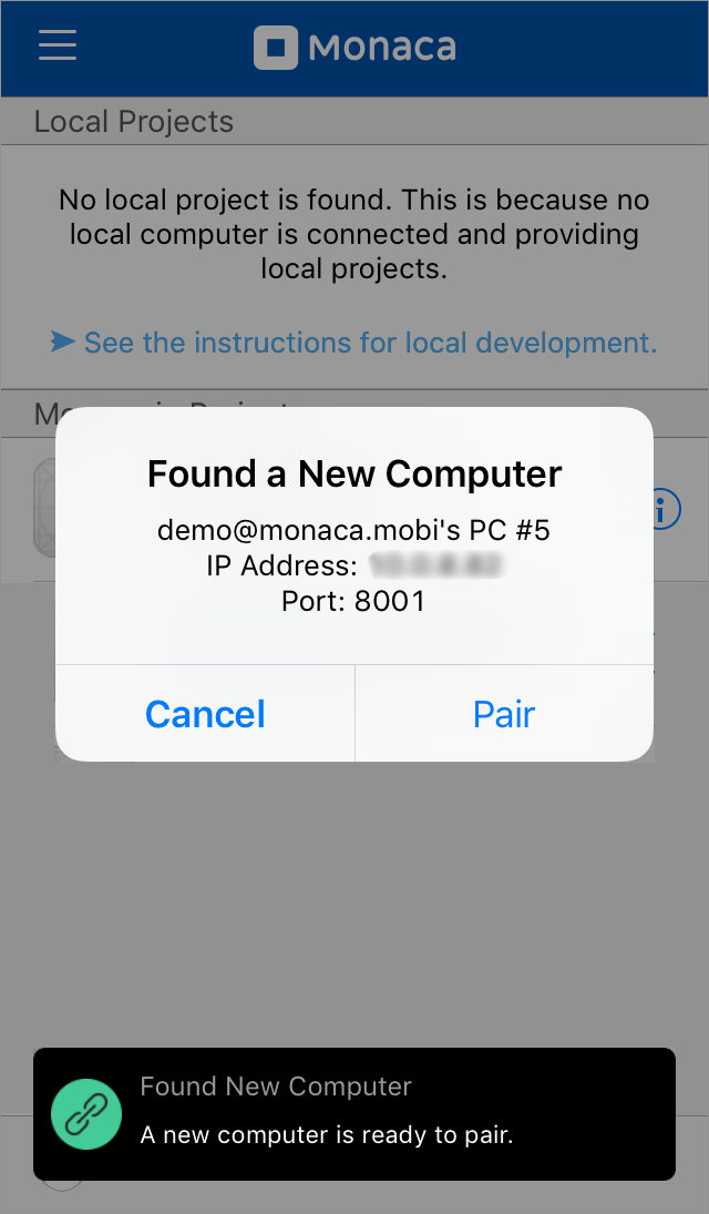 6. If the pairing is successful, your local project name will appear under Local Projects in Monaca Debugger. However, if the pairing fails, please refer to Fail to pair the Monaca Debugger.