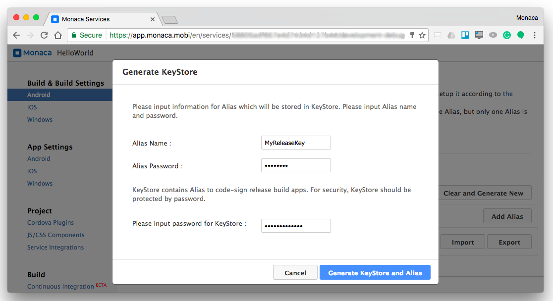 A KeyStore is required for building a release version of your Android app. In Monaca, you can either create a new KeyStore or import an existing one. In order to create a new KeyStore, please do as follows: