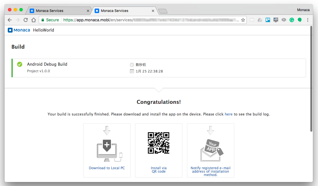 4. It may take several minutes for the build to complete. Once the build is completed, your app is ready to be installed/downloaded. See the screenshot below as an example: