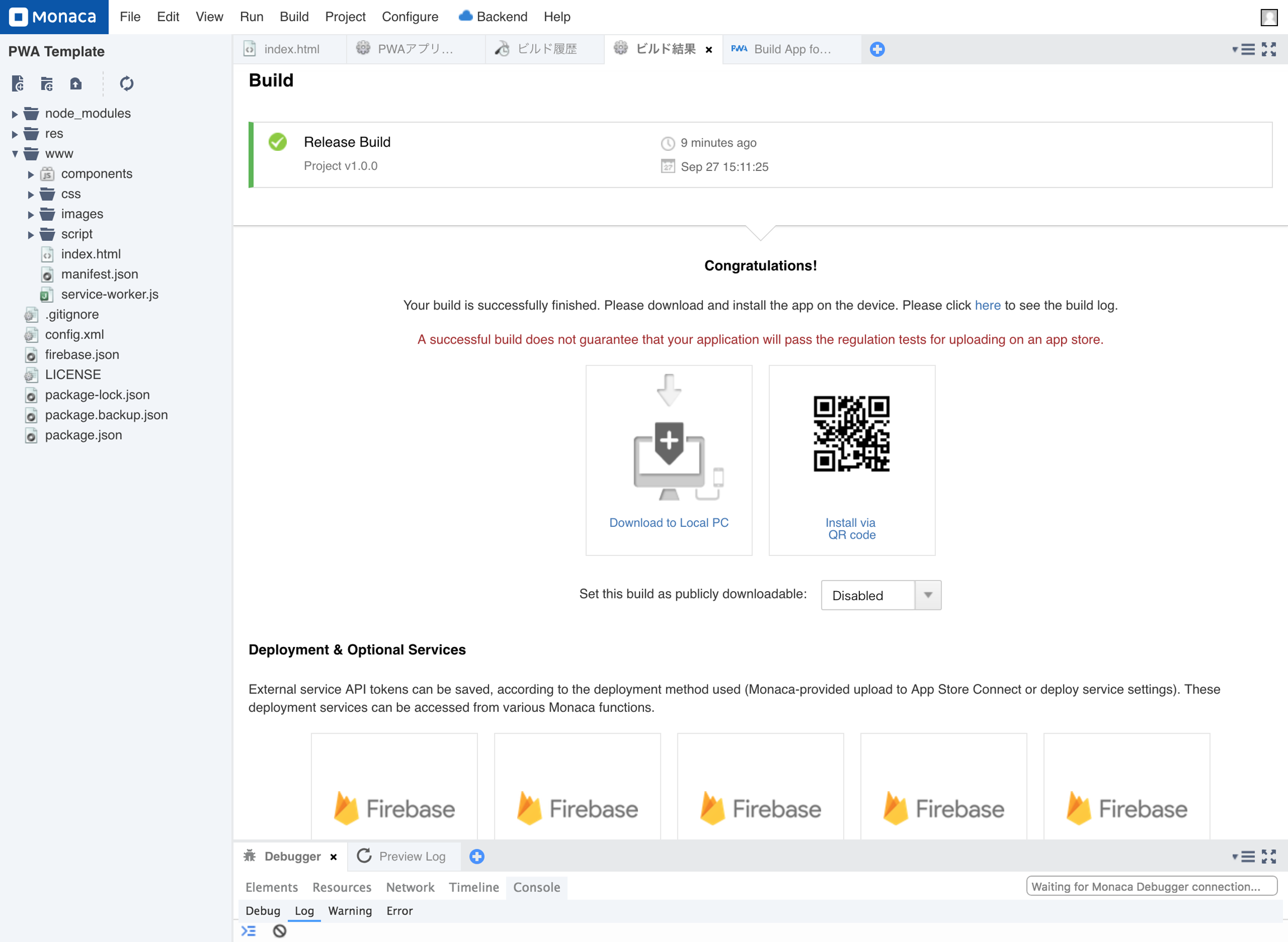 From the Monaca Cloud IDE menu, go to Configure → App Settings for PWA.