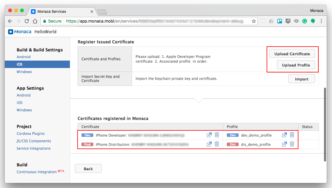 6. Upload the certificates and corresponding provisioning profiles to the Monaca Cloud.