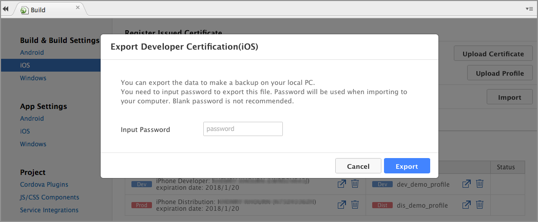 In case you've already configured your build settings (private keys and certificates) in your Mac OS X (Xcode) and you want to export them to the Monaca Cloud IDE, follow these instructions: