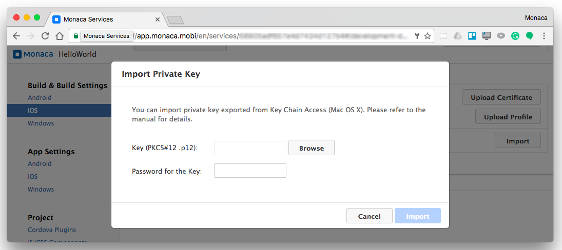 To import the private key and certificate in Monaca Cloud IDE, follow the instructions below: