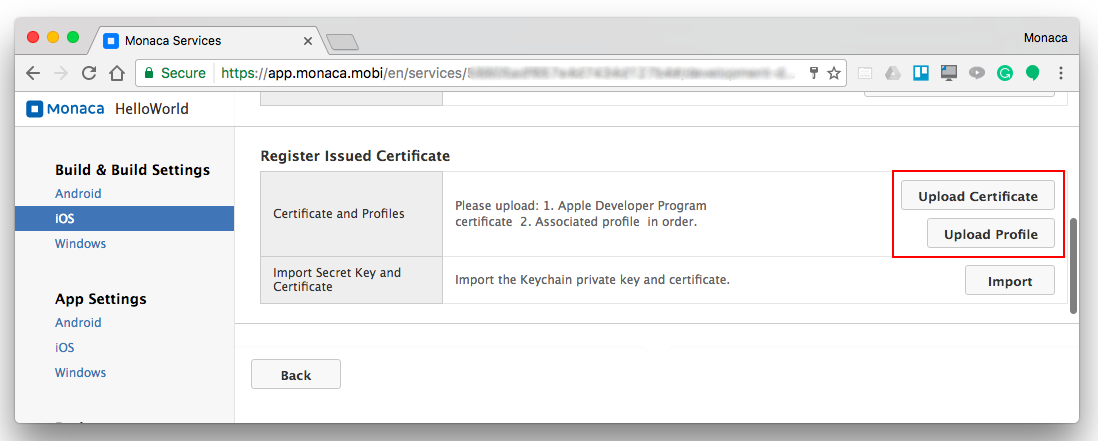 From the Monaca Cloud IDE menu, go to Configure → iOS Build Settings. Then, click Import.