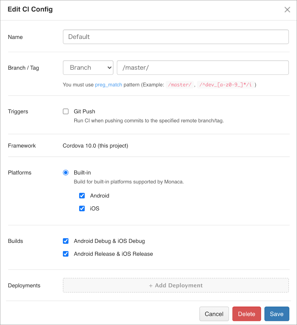 To use the Monaca CI to create a release build for iOS and Android when pushing the project code to a branch called master, read the following instructions. You can also use the Monaca CI to distribute the built files to two deployment services such as DeployGate and HockeyApp.