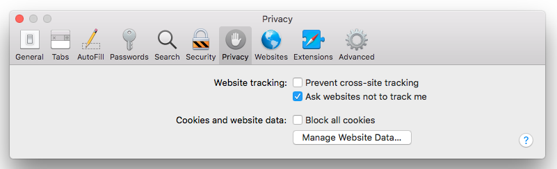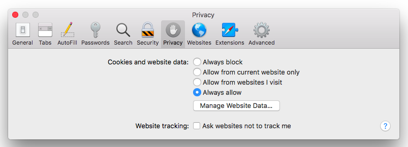 Privacytab might look different in different OS versions. Please make sure that the cookies are unblocked and the cross-site tracking is allowed. Here is an example: