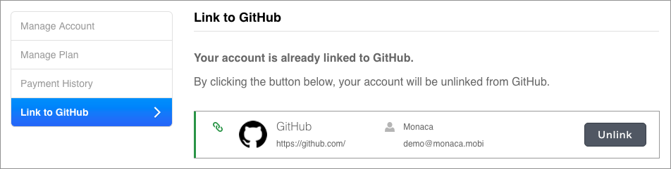 5. After this, your Monaca account should be linked to your GitHub account. You can confirm this on the Link to GitHub page. It should look like this: