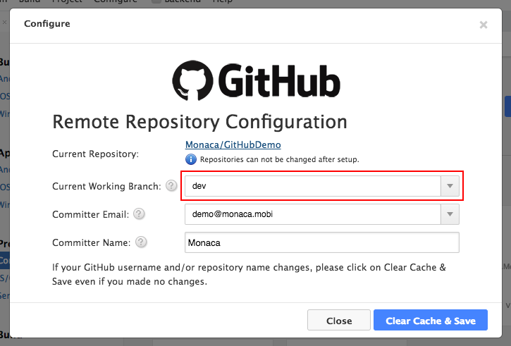 At this point you should have linked your Monaca account to GitHub. To connect a Monaca project to the new repository, you will need to do some configurations in the Monaca Cloud IDE: