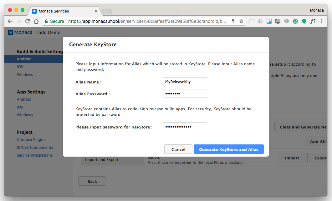 To configure an Android KeyStore in Monaca, follow the instructions below:
