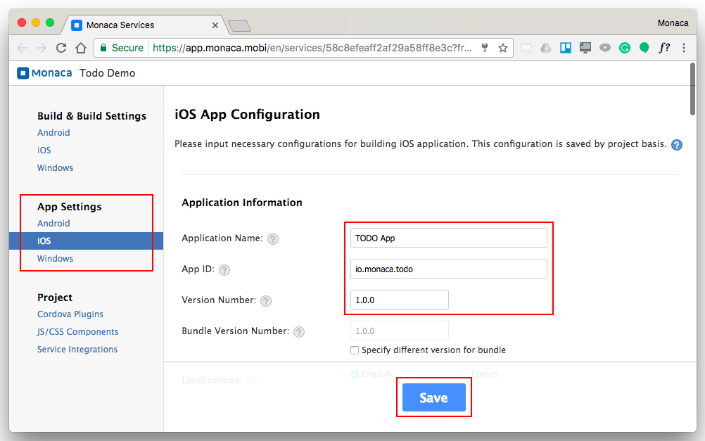 Application Name: a name representing your app in the App Store.App ID: a unique ID representing your app. It is recommended to use the reverse-domain style (for example,mobi.monaca.appname) for app ID. Only alphanumeric characters and periods (at least one period must be used) are allowed.Version Number: the number representing the version of your app. It will be required when uploading (publishing process) your application via App Store Connect later. It needs 3 numbers separated by dots (for example,1.10.2). Each number should be between[0-99].The remaining information is optional. For example, you can configure the icon and splash screen of the app.