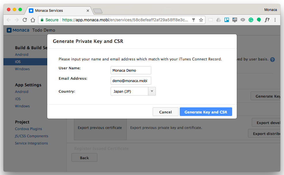 2. Click the Generate Key and CSR button and fill in your Apple ID information (user name and email address) and country. Then, click Generate Key and CSR. After that, you will be asked to download the CSR file. You can also import an existing private key if you have one.