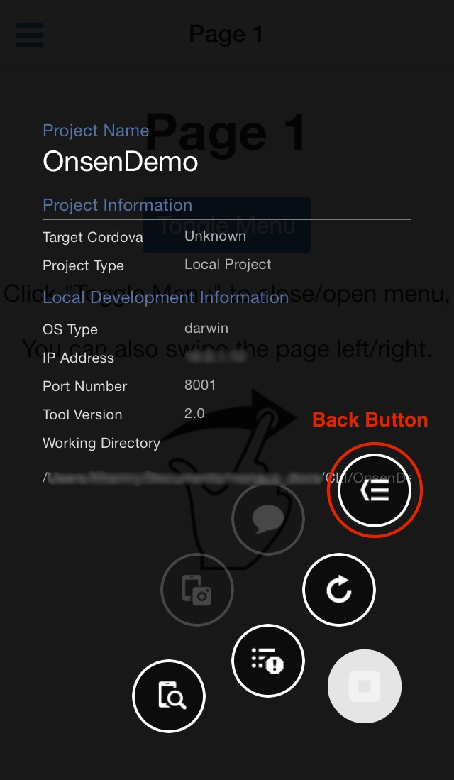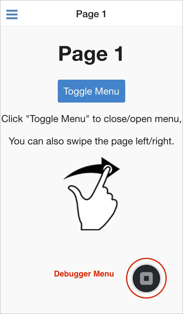index.htmlfile. Then, change themain-pageattribute (inside<ons-sliding-menu>tag) topage2.htmland save your changes. The updated code should look like this:... <ons-sliding-menu var="app.slidingMenu" menu-page="menu.html" main-page="page2.html" side="left" type="overlay" max-slide-distance="200px"> </ons-sliding-menu> ...If your PC is still connected to the Monaca Debugger, it will automatically refresh the updates. Now your starting page should be the page 2.