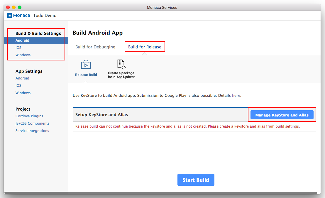 2. Under the Build & Build Settings in the menu on the left, select Android. Then, choose Build for Release and select Manage KeyStore and Alias.