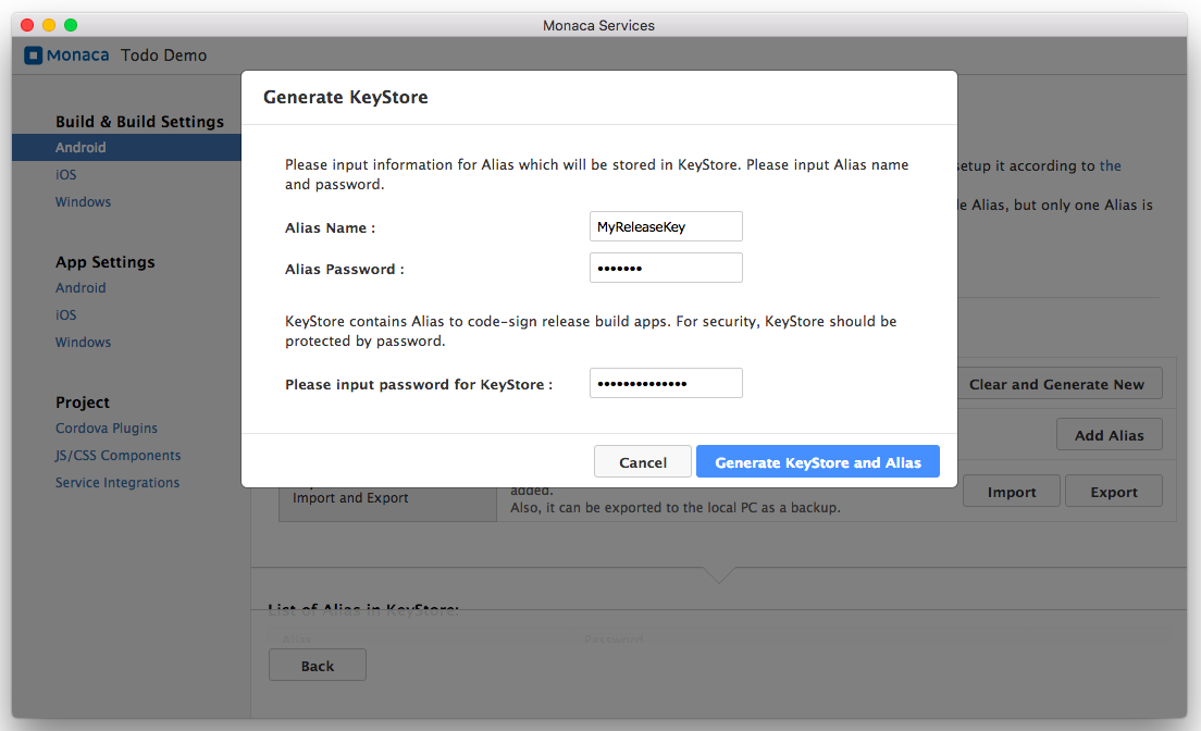 In order to configure a new Android KeyStore in Monaca, follow the instructions below:
