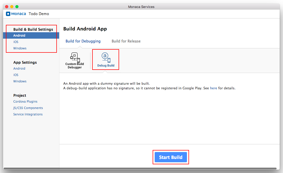 2. Under the Build & Build Settings in the menu on the left, select Android. Then, select the Debug Build option. Finally, click the Start Build button.