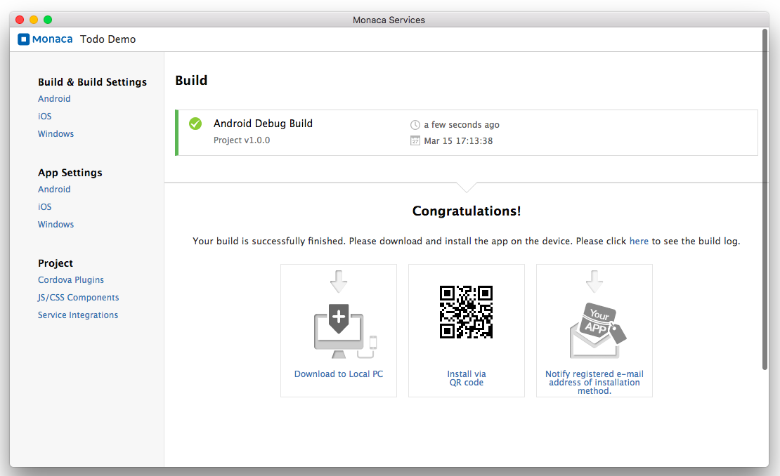 In this section, we will talk about how to create a debug build of your Monaca app for Android. For more information about the types of build, please refer to Types of Build.