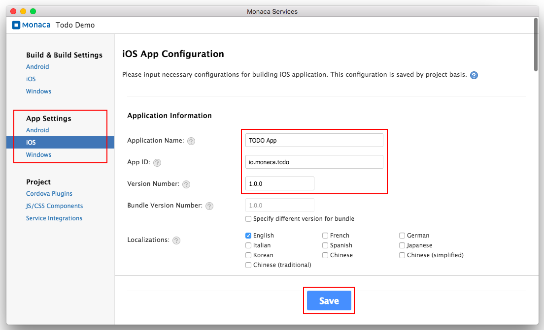 Application Name: the name representing your app in the Market.App ID: a unique ID representing your app. It is recommended to use reverse-domain style (for example,mobi.monaca.appname). Only alphanumeric characters and periods (at least one period must be used) are allowed.Version Number: The number representing the version of your app. It will be required when uploading your application via App Store Connect later (publishing process). It needs to be three numbers separated by dots (for example, 1.10.2). Each number should be between[0-99].The remaining information is optional. You can set for example the icon and splash screen.