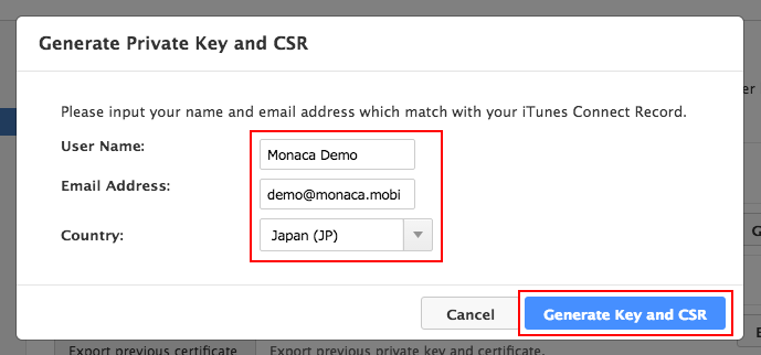 3. Click the Generate Key and CSR button and fill in your Apple ID information (user name and email address) and country. Then, click Generate Key and CSR. After that, you will be asked to download a CSR file. You can also import an existing private key if you have one.