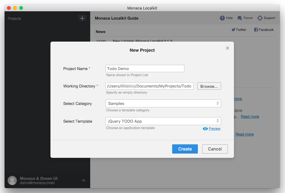 Project Name: create a name to represent your new project in the project list.Working Directory: specify a directory where you want to save your project files.Select Category: choose a template category for your new project.Select Template: choose a template for your new project. Click the Preview button to see how each template looks like.