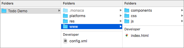 2. A new window showing your project files folder will open. The project files that you will be editing are in the www folder. The components folder consists of project’s dependencies such as jQuery Mobile. You can ignore this folder. Use any code editor you like to edit the project files such as JavaScript, CSS and HTML files.