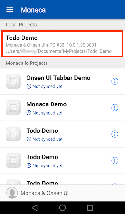 If the pairing succeeds, your project list will appear in the Monaca Debugger and the connected debugger will appear in the Monaca Localkit (see the screenshots below). However, if the pairing fails, please refer to Troubleshoot pairing.