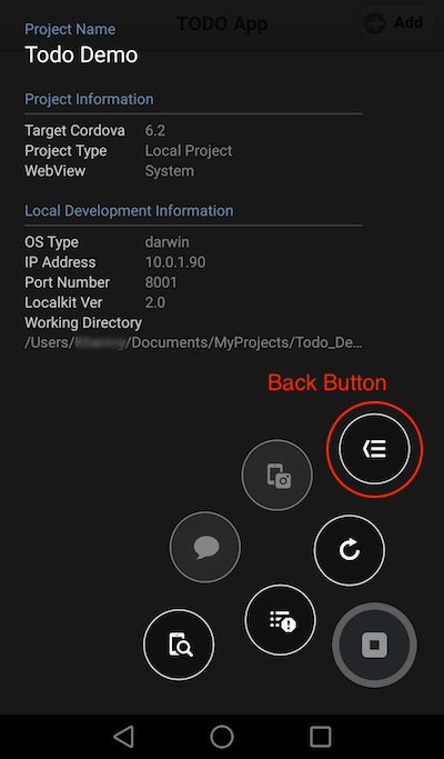 4. Now the screen of your device should look like in the screenshot below. Touch the Back button within Debugger Menu to go back to the Project List screen.